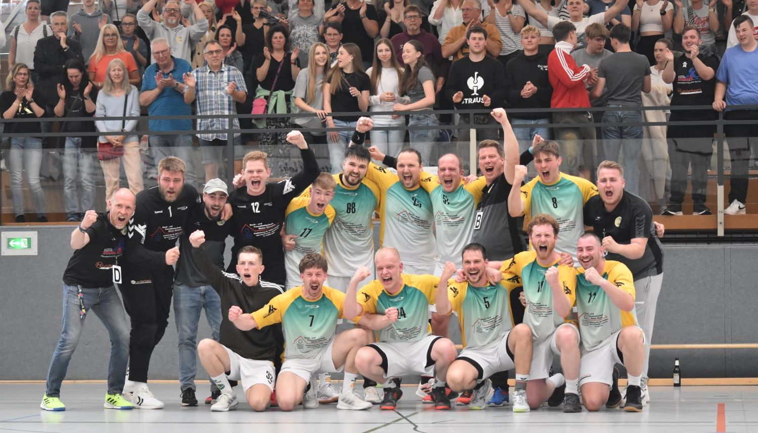 Mit Wiederanpfiff zeigten die Gensunger nun ihre Stärken mit schnellem Umschaltspiel und entschlossenen Abschlüssen aus dem Rückraum. Nach nicht einmal drei Minuten war die ESG auf 15:18 enteilt und unser Team hatte in dieser Phase schwer zu kämpfen, damit der Vorsprung nicht noch weiter anwuchs. Bis zum 18:22 nach 40 Minuten gelang dies gut und eine folgende Überzahlphase nutzten wir gnadenlos aus, um wieder auf Unentschieden zu stellen (22:22 45.). Falk Merwar, Christian Vogel und der starke Simon Gummich stellten bis zur 55. Minute auf 27:24. Doch eine Vorentscheidung war es nicht – eine Zeitstrafe gegen uns nutzte die Mannschaft um Tim Schanze aus und verkürzte wieder auf ein Tor zum 27:26 nach 57 Minuten. Mit Blick auf das Gesamtergebnis für den Aufstieg konnte es nicht spannender sein. Die Entscheidung fiel erst in den letzten 40 Sekunden der Partie. Zunächst gelang Leon Dudenhöfer nach starkem Anspiel von Falk Merwar der erlösende Treffer zum 28:26, ehe Nico Lohrbach mit einer 7m-Parade 13 Sekunden vor dem Ende den Sieg und den damit verbundenen Aufstieg perfekt machte.